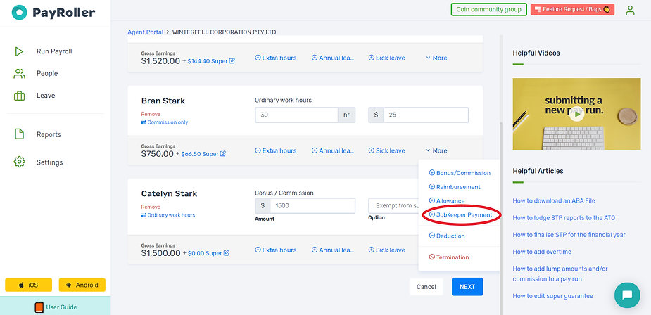 4. For employees who earned less than $1,500, you will need to provide them with a top up. To do this, click on More and select JobKeeper. Enter the amount needed to make the total $1,500 and click on Add to the payslip.